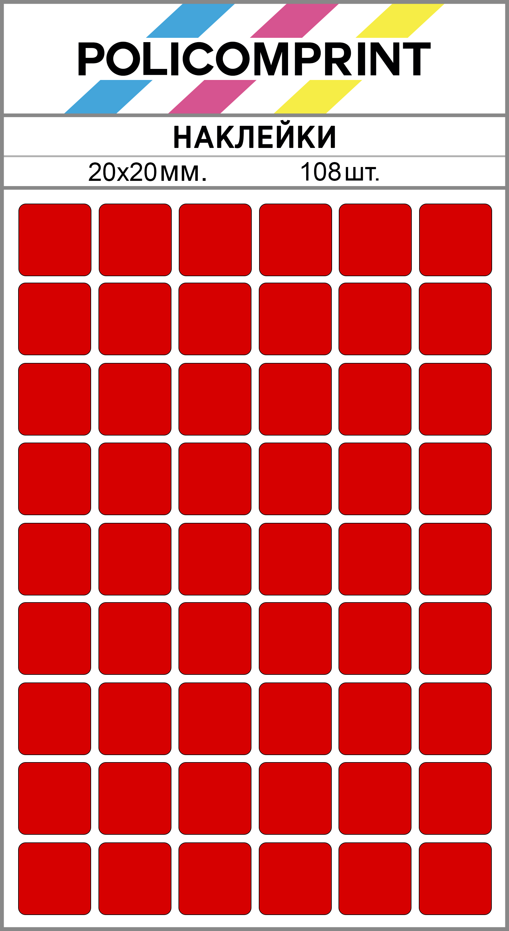 Наклейки Policomprint предназначены для маркировки, организации, планирования и хранения. В упаковке вы найдете 108 квадратных наклеек размером 20х20 мм., которые помогут вам быстро и легко организовать свои вещи.